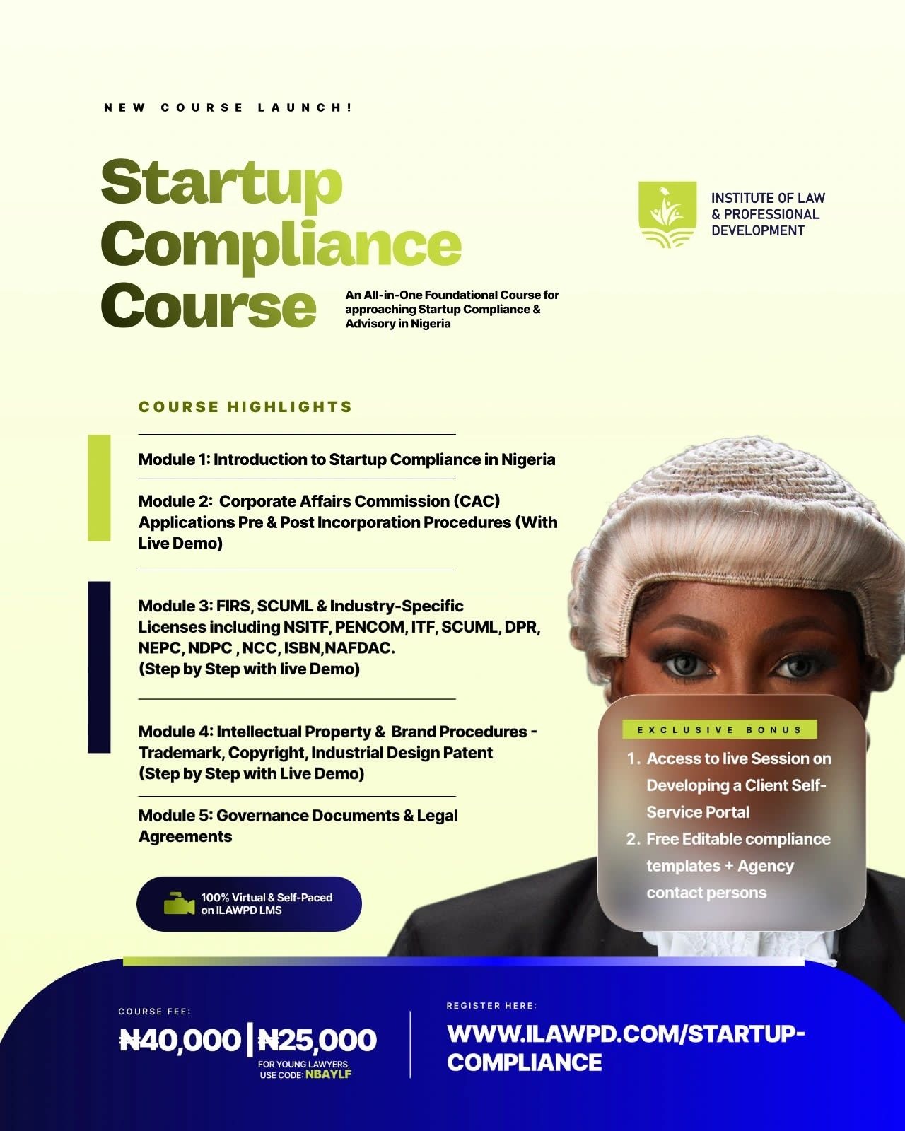 Startup Compliance Course is officially here, your all-in-one guide to CAC filings, regulatory licensing, IP procedures, and legal documentation for Nigerian businesses.